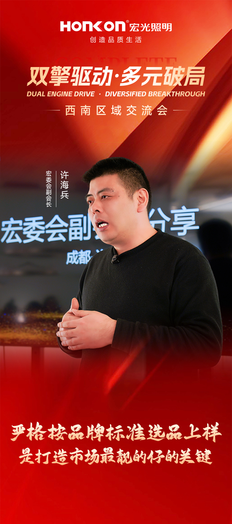 在本次交流会上,黄董首先对当前照明行业的整体形势进行了深刻剖析。他指出,市场产品过剩、同质化严重,想靠价格竞争是无法实现可持续发展。面对激烈的市场竞争,宏光照明始终坚持价值驱动,不卷价格,而是聚焦于模式与价值创新,通过不断提升产品和服务,持续为经销商赋能。在结合市场需求与宏光自身优势的基础上,黄董提出了以“双引擎多元化模式”为核心的发展策略。