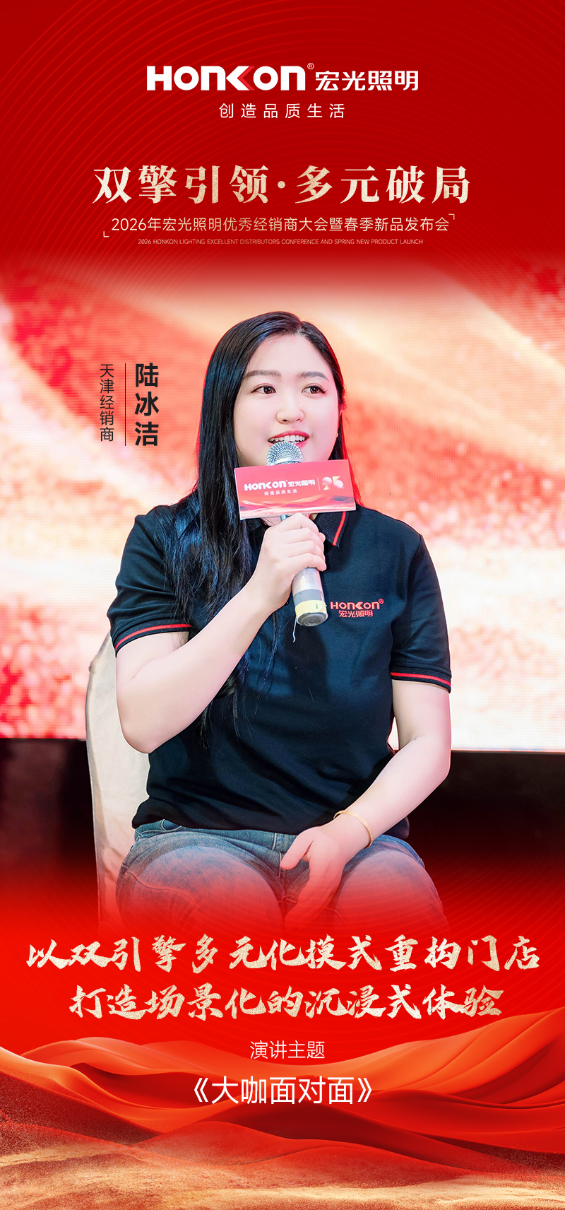 首位登台分享的是与宏光照明携手十多年的浙江宁波经销商赵总,他以 《“信心”“远见”与“选择”》 为主题,分享了自己的经营心得。作为陪伴品牌十余年的老战友,赵总见证了宏光一路的成长与蜕变。今年,当他看到公司“双引擎多元化”模式落地后,范总、彭总、罗总等经销商标杆所呈现的全新店态与亮眼业绩,深受触动。这套模式的可行性在他心中得到印证,也让他更加坚定了加大投入的决心。基于对品牌战略的深度认同,赵总今年果断决策——开设第二家门店,将这套经过验证的成功模式在自己手中复制放大。从十余年坚守到果断开二店,赵总的分享不仅是一段经营历程的真诚讲述,更以亲身选择印证了“相信品牌、紧跟战略、持续投入”所带来的长期价值,赢得现场阵阵掌声。