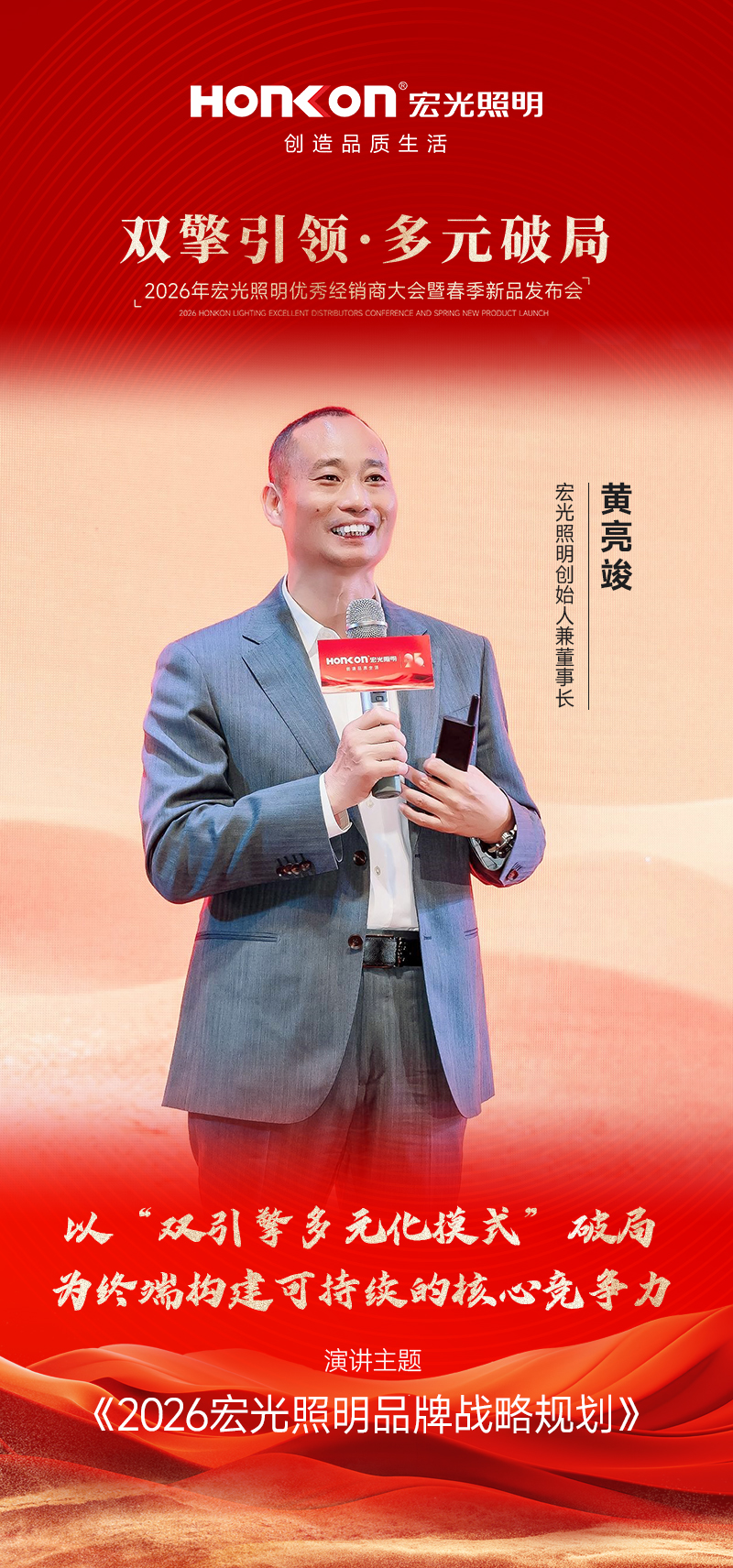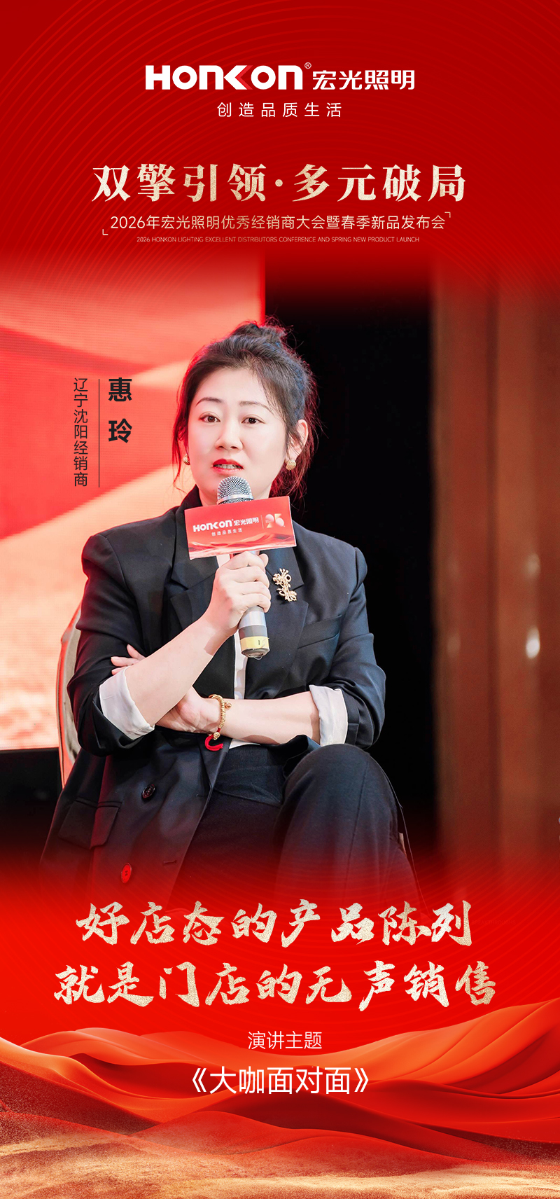 与此同时,黄董强调,以“多元风格+全价位覆盖”的产品矩阵夯实增长底盘,形成从现代灯、商照、宏光智能,到意式风、中古风、奶油风、宏光臻选、全光谱等系列的完整阵容,覆盖高中低全价格梯度,以全场景、全需求的供给能力满足不同客群的选择。以“整店布局”的思维做产品组合与陈列规划,让产品矩阵成为门店差异化的关键抓手,持续带动业绩自然增长;同时也要求经销商紧跟总部节奏、同频共振,把总部的产品与策略优势更快转化为终端战斗力。