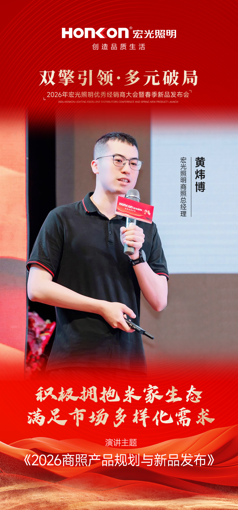 随后进入商照智能产品发布环节,宏光照明商照总经理黄炜博发表了《2026商照产品规划与新品发布》演讲。他重点介绍了商照产品矩阵的升级与宏光智能系统,并正式宣布宏光照明产品支持米家APP控制。基于双方深度合作,宏光推出了一系列深度融合的全屋智能新品,通过技术互补与生态协同,实现照明设备与家庭场景的智能联动,为用户提供体验更统一、操作更便捷的智慧家庭解决方案,助力经销商抢占智能家居市场新风口。