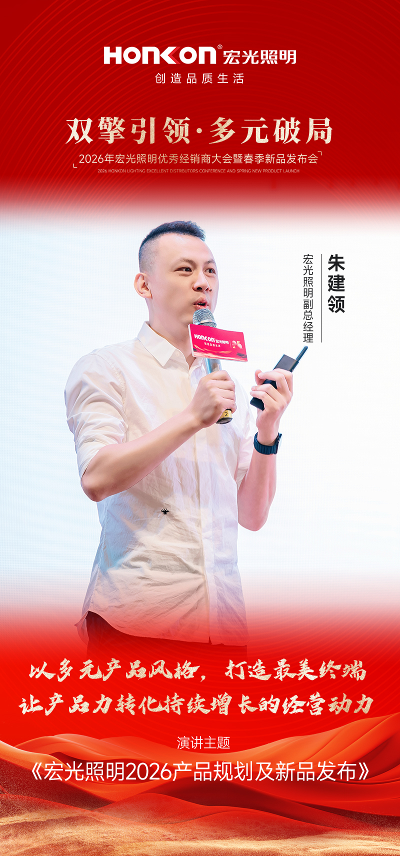 作为发布会的重要环节,宏光照明副总经理朱建领发表了《宏光照明2026产品规划及新品发布》的主题演讲。他介绍,此次发布的新品矩阵全面覆盖现代简约、轻奢、简奢、意式风、中古风、奶油风等主流风格元素,精准捕捉当下年轻消费群体的审美偏好,全方位满足多元化、个性化的市场需求。