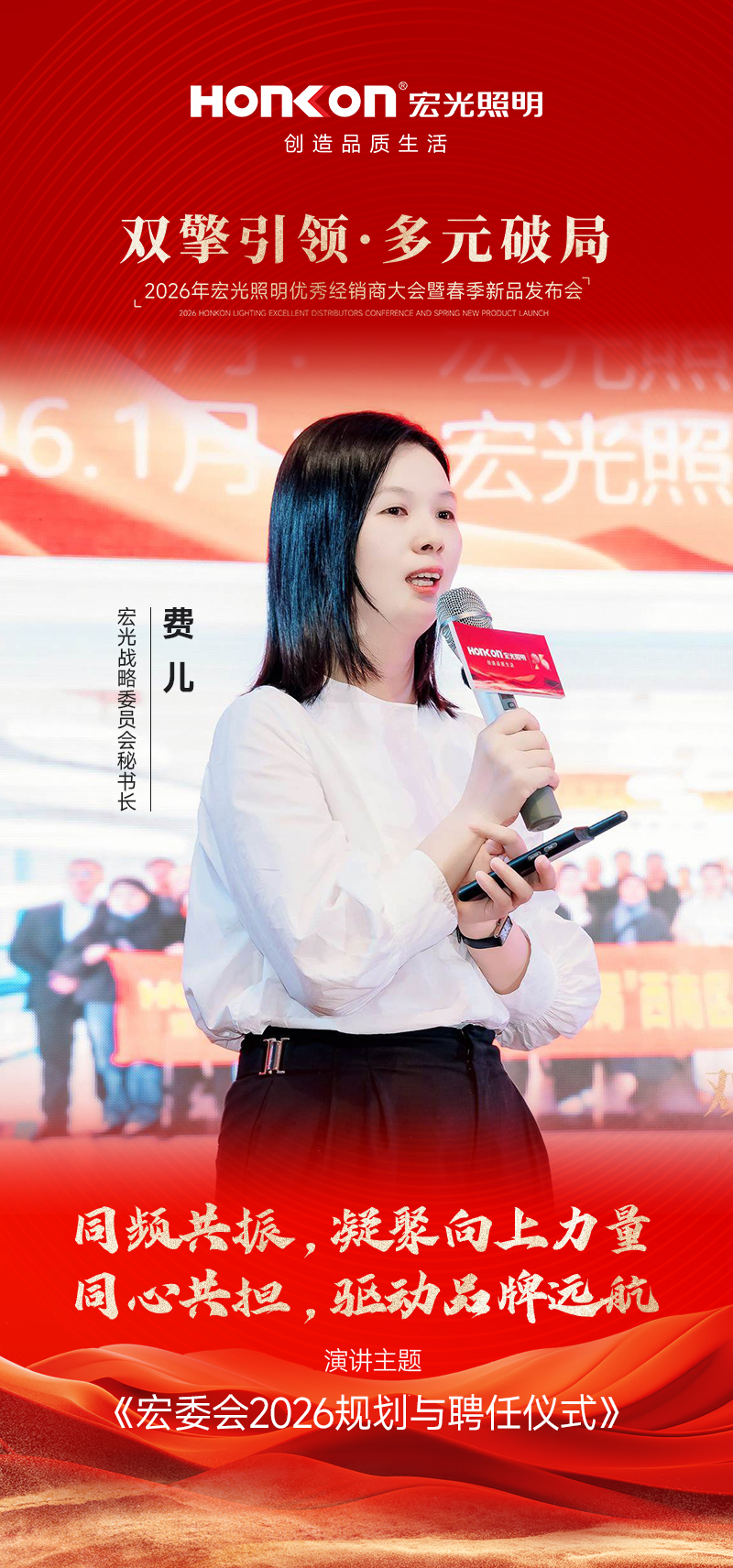 大会迎来重要议程,宏光照明战略委员会秘书长费儿上台发布《宏光照明战略委员会2026规划》。她深情回顾了过去一年全体委员携手同行的奋斗历程,并对新一年的组织建设与赋能方向作出清晰规划。