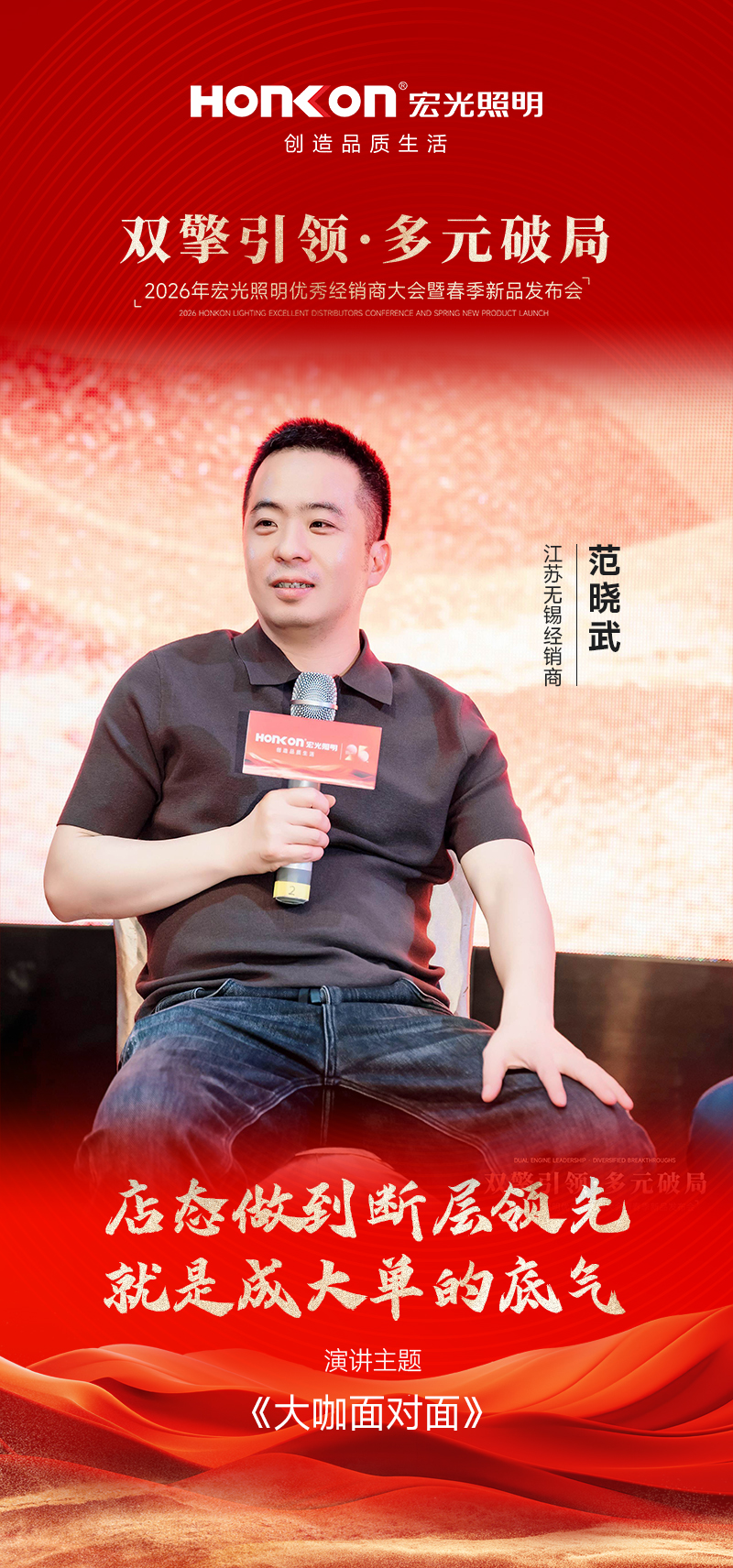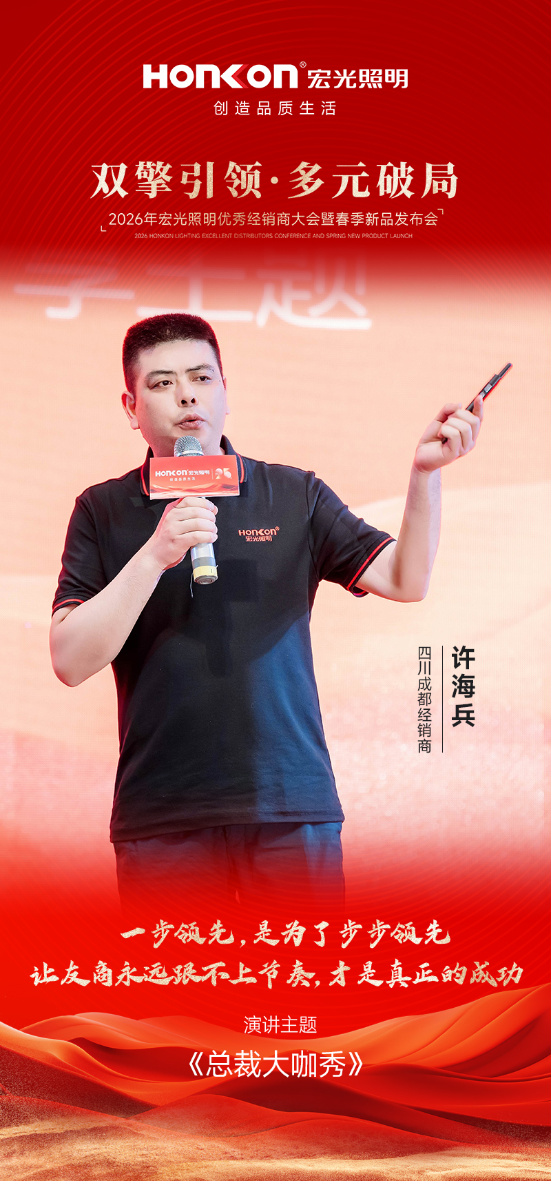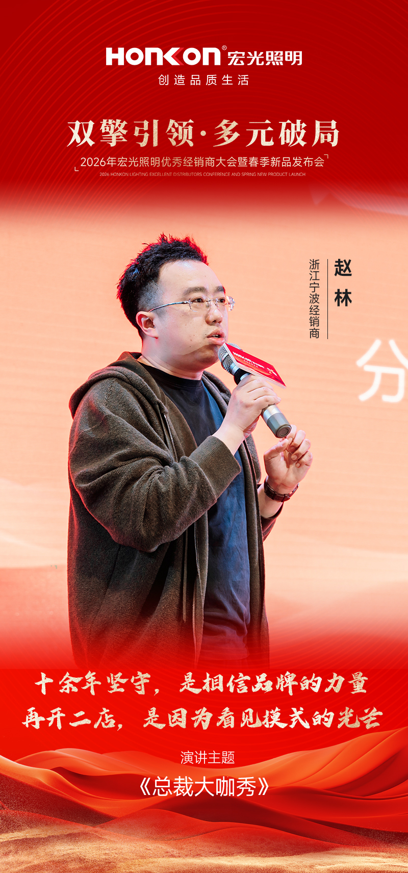 首位登台分享的是与宏光照明携手十多年的浙江宁波经销商赵总,他以 《“信心”“远见”与“选择”》 为主题,分享了自己的经营心得。作为陪伴品牌十余年的老战友,赵总见证了宏光一路的成长与蜕变。今年,当他看到公司“双引擎多元化”模式落地后,范总、彭总、罗总等经销商标杆所呈现的全新店态与亮眼业绩,深受触动。这套模式的可行性在他心中得到印证,也让他更加坚定了加大投入的决心。基于对品牌战略的深度认同,赵总今年果断决策——开设第二家门店,将这套经过验证的成功模式在自己手中复制放大。从十余年坚守到果断开二店,赵总的分享不仅是一段经营历程的真诚讲述,更以亲身选择印证了“相信品牌、紧跟战略、持续投入”所带来的长期价值,赢得现场阵阵掌声。