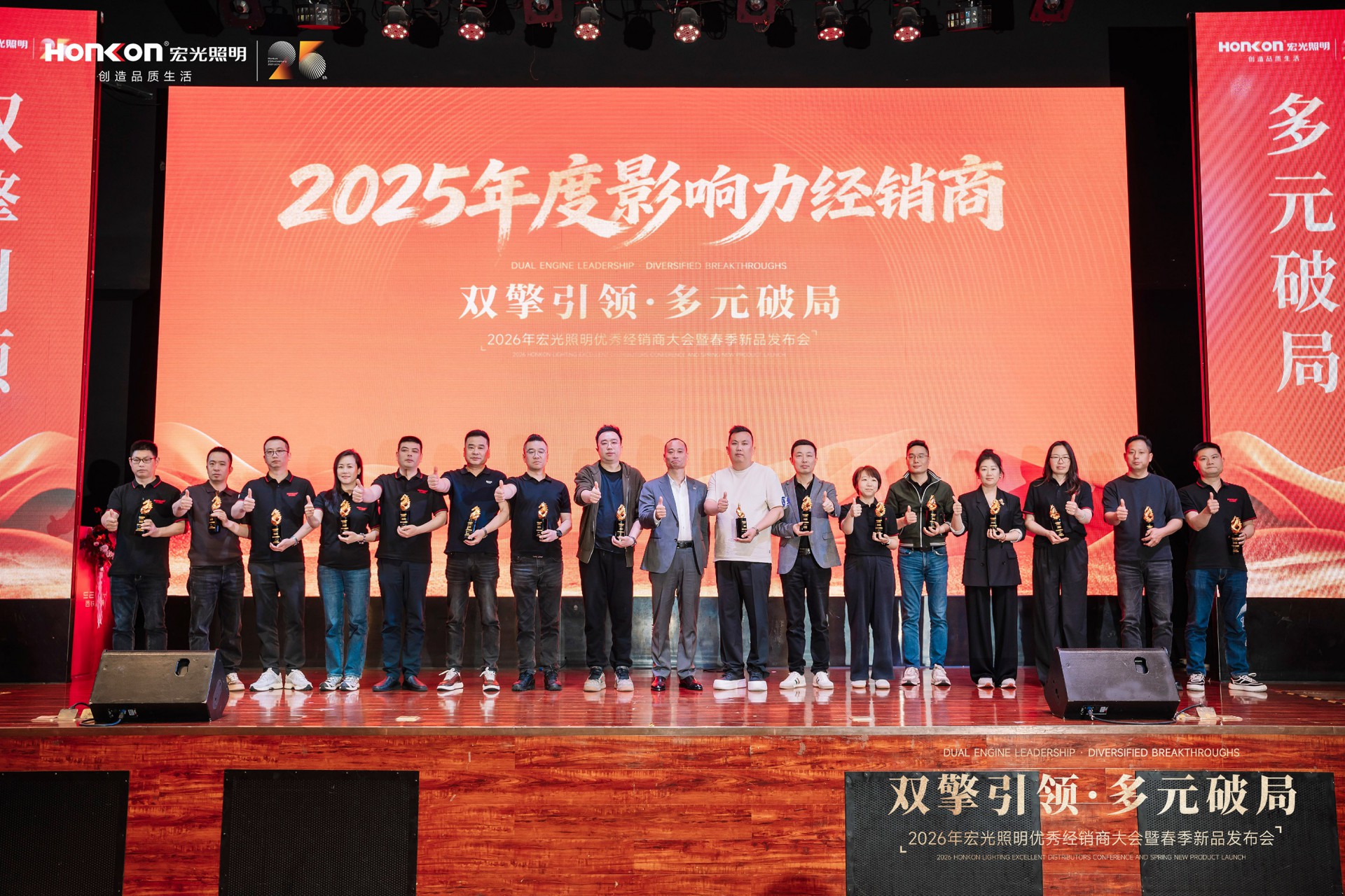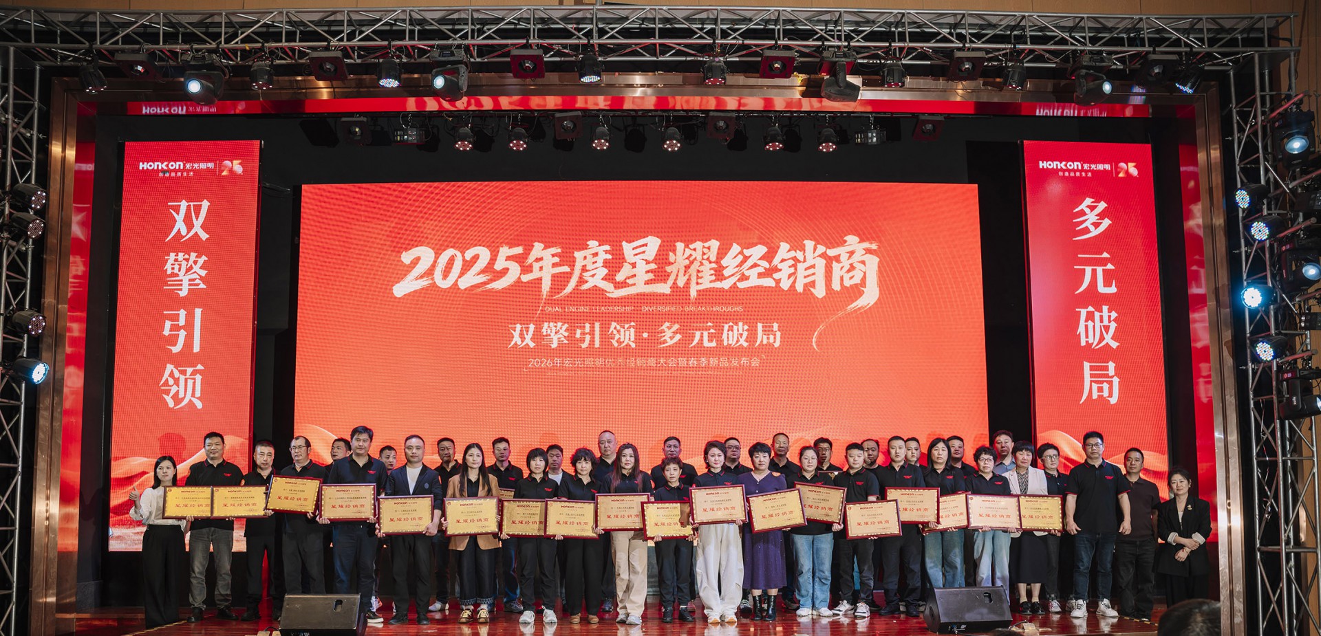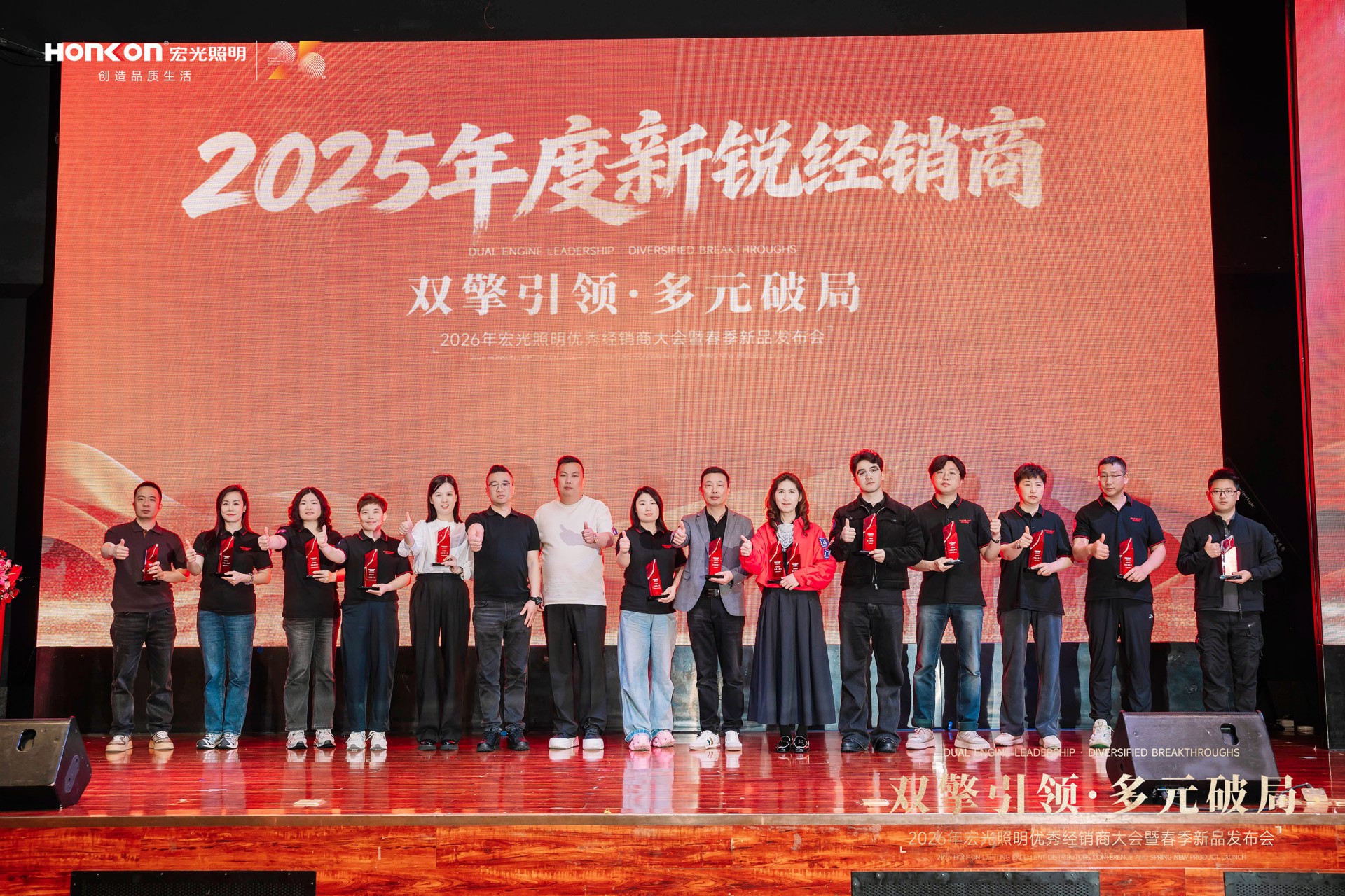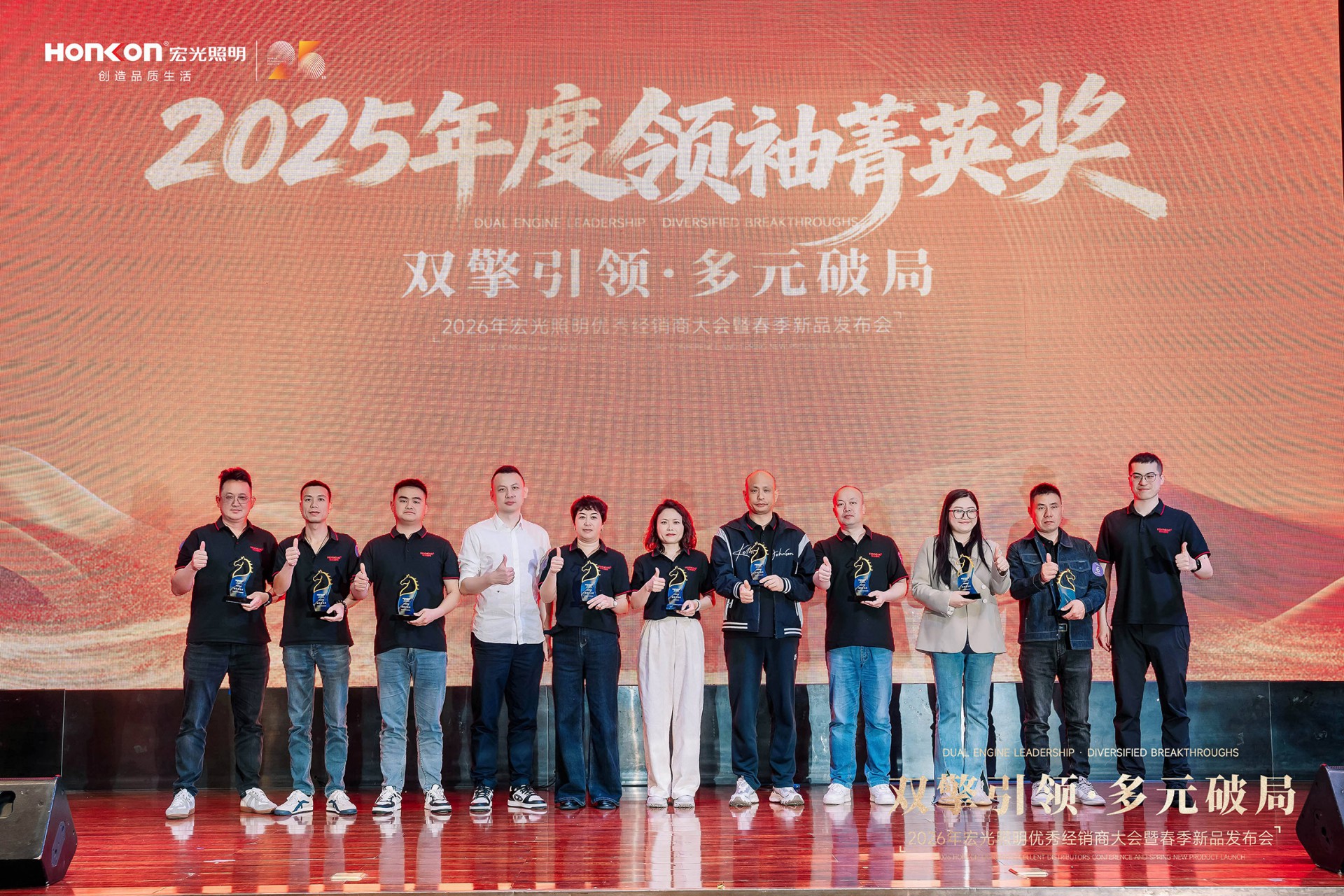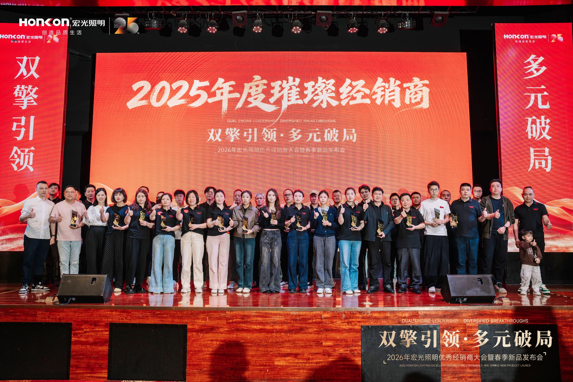 在智慧碰撞与经验共享之后,大会迎来荣耀时刻——2025年度优秀经销商颁奖盛典隆重举行。榜样的力量,在此刻闪耀。一张张熟悉的面孔走上舞台,他们不只是获奖者,更是宏光一路同行的见证者与共建者。这份荣誉,是品牌对奋斗者的致敬,更是经销商与宏光双向奔赴的最好印证。每一座奖杯背后,都是市场的认可;每一次掌声响起,都是对下一个标杆的期许。荣誉加身,责任在肩,他们将继续以先行者的姿态,引领更多人迈向新的高度。